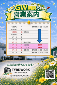 当店では夏タイヤへの交換、絶賛予約受付中です。また、タイヤ点検も無料で実施しております。